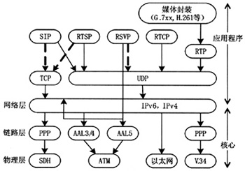 图1是基于SIP的IP网络多媒体通信系统的协议栈结构。从SIP在Internet协议栈中的位置,可以看出,SIP是应用层上的一个控制(信令)协议。IETF制定IP 网络多媒体通信标准的一个重要原则是最大限度地重用已有的协议。其中每一个协议完成一种功能,端系统和网络服务器根据其提供的服务,只需实现相应的协议,不但有利于提高系统的模块性、灵活性、简易性和可扩展性,而且可简化互操作性问题[2]。