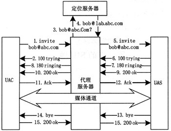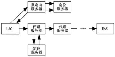 如图2所示,SIP网络采用IP 网络常用的客户机/服务器(C/S)结构,定义了若干种不同的服务器和用户代理,通过与服务器之间的请求和响应完成呼叫和传送层的控制。