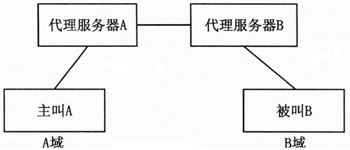 图3给出了上述SIP消息选路过程。主叫A接入A域的代理服务器A后,代理服务器A查询DNS,得到B域的代理服务器B的地址。最后由代理服务器B将invite消息发送至被叫B。在软交换网络中,代理服务器A和代理服务器B的功能都由软交换机实现。