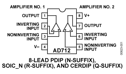 AD712采用标准运算放大器引脚排列配置,按性能分为七种等级。AD712J和AD712K的额定温度范围为0°C至+70°C商用温度范围。AD712A、AD712B和AD712C的额定温度范围为-40°C至+85°C工业温度范围。AD712S和AD712T按照MIL-STD-883B Rev. C标准加工,额定温度范围为-55°C至+125°C军用温度范围。另外还有扩展可靠性、增强筛选型产品,其额定温度范围为商用和工业温度范围。增强筛选方法包括168小时老化测试,以及其它环境和物理测试。AD712提供8引脚小型塑封DIP、SOIC、cerdip、TO-99金属帽壳四种封装及裸片形式。AD712-EP支持防务和航空航天应用(AQEC标准)