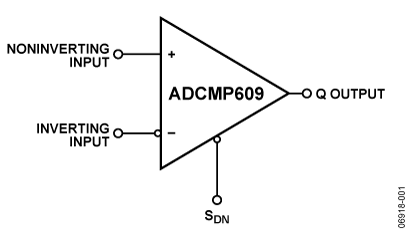 ADCMP609是一款快速比较器,采用ADI公司的专有XFCB2工艺制造。这款比较器具有极其丰富多样的功能特性,并且易于使用,具体包括:输入范围从V EE − 0.2 V至VCC + 0.2 V,低噪声,TTL-/CMOS-兼容输出驱动器,以及可调迟滞功能和/或关断输入。在电源电流典型值为500 µA时,该器件提供40 ns传播延迟、10 mV过驱性能,可驱动15 pF负载。这款器件提供灵活的电源方案:可采用+2.5 V单正电源供电时,输入信号范围为-0.2 V至+3.0 V;也可采用最高+5.5 V正电源供电,输入信号范围为-0.2 V至+5.7 V。TTL-/CMOS-兼容输出级旨在以全部额定定时特性驱动最高15 pF电容;当增加额外电容时,输出级性能以线性方式适度降低。比较器输入级提供鲁棒的较大输入过驱保护;当输入超过有效输入信号范围时,输出不会反相。该器件还具有可编程迟滞特性。ADCMP609采用8引脚MSOP封装,提供关断引脚和迟滞控制特性。