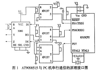 AT90S8515 与上位PC机通信采用RS485总线,通过RS-485接收/发送器连接,使用MAXIM公司的MAX3080CPD芯片,为了使电磁干扰及终端末匹配的连接所产生的反射最小,MAX3080适合速率为115Kbps以下的应用,而且具有平衡发送,差分接收,抑制共模干扰和故障保护的特点,适合远距离传送。为提高系统可靠性,在MAX3080与CPU之间还可增加光电耦合器6N137,更好地与上位机电气隔离。硬件连接原理图如图1所示。