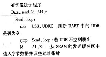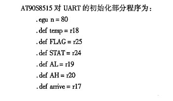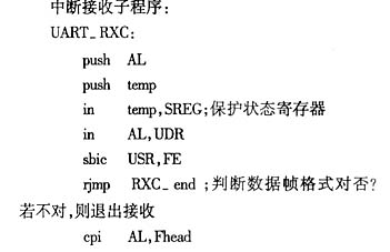 式,具有120条功能强大的指令,而且大多数执行时间为单时钟周期,指令周期最短仅为125ns。它具有以下主要特征:片内有8K字节可下载的Flash存储器,程序下载采用其SPI串行接口,使用寿命为1000次;32条通用I/O线及32个通用8位寄存器R0~R31,64个I/O专用寄存器;512字节的EEPROM(使用寿命为10万次)及512字节的内部SRAM;供电电压在VCC为4.0~6.0V内可以全静态工作范围为0~8MHz;提供内部及外部中断源;带片内晶振器的可编程看门狗定时器;并有2种可通过软件选择的电源节电模式:闲置模式、掉电模式;可编程的全双工串行通信接口UART;一个8位定时器/计数器T/C0,一个16位的带预分频及比较模式、捕获模式及双工8位、9位或10位的PWM输出的定时器/计数器T/C1。本文着重介绍其片内UART在实际中的应用。