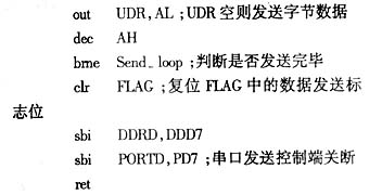其数据发送通过把被传送的数据写入UART的I/O数据寄存器UDR来初始化,然后数据从UDR传送到移位寄存器中。在波特率时钟加载到移位寄存器的传送操作时,起始位从TXD引脚移出,然后是数据最低位在先。当停止位被移出时,如果在传送中有新数据写入UDR中,则被装入移位寄存器中,同时,UART的状态寄存器USR的UDRE位(UART状态寄存器空)被设置,直到UDR被重写。当没有新的数据被写入时,而且停止位在TXD上保持了一位的长度,USR的TX完成标志位TXC被设置。