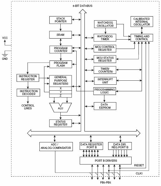 VCC:数字电路的电源 GND:地 端口B (PB5..PB0):端口B 为6 位双向I/O 口,具有可编程的内部上拉电阻。其输出缓冲器具有对称的驱动特 性,可以输出和吸收大电流。作为输入使用时,若内部上拉电阻使能,端口被外部电路拉低时将输出电流。在复位过程中,即使系统时钟还未起振,端口B 处于高阻状态。 端口B 也可以用做其他不同的特殊功能,请参见DataSheet 数据手册 P48。 RESET:复位输入引脚。持续时间超过最小门限时间的低电平将引起系统复位。门限时间见 DataSheet 数据手册P30Table 12。持续时间小于门限时间的脉冲不能保证可靠复位。