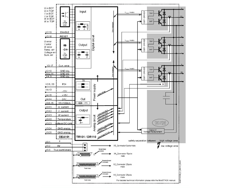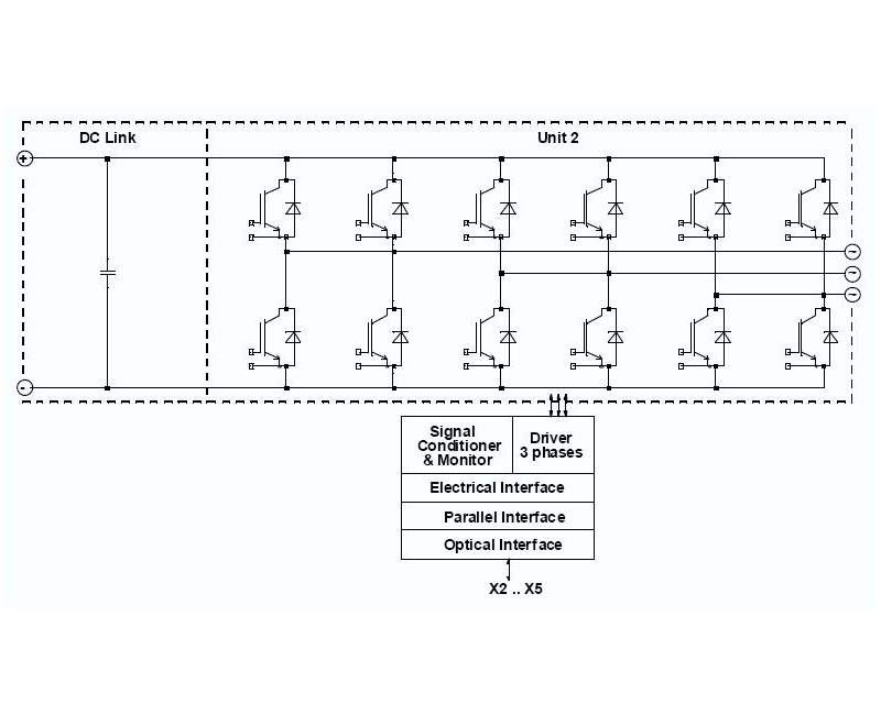 - Voltage signals for control and monitoring (currents, voltages, short circuit, heat sink temperature, failure signals)