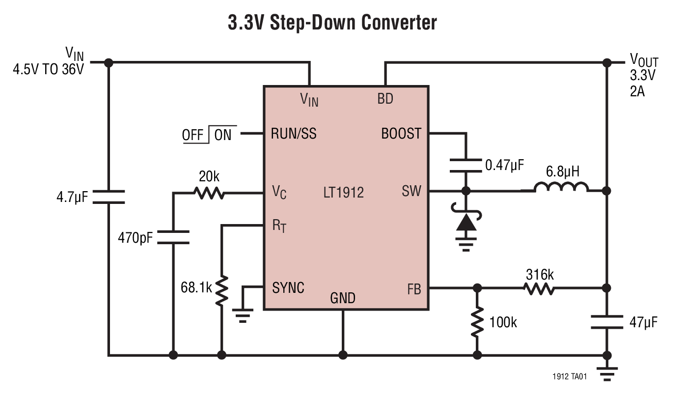 LT®1912 是一款可调频率 (200kHz 至 500kHz) 单片式降压开关稳压器,可接受高达36V 的输入电压。一个高效率 0.25Ω 开关与一个升压肖特基二极管以及必需的振荡器、控制器和逻辑电路一起被集成在芯片上。电流模式拓扑结构用于实现快速瞬态响应和上佳的环路稳定性。LT1912 允许使用陶瓷电容器,因而可在最大限度地缩减总体解决方案外形尺寸的同时可产生低输出纹波。低电流停机模式把输入电源电流减小至 1μA 以下,而 RUN/SS 引脚上的一个电阻器和电容器则提供了一个受控的输出电压斜坡 (软起动功能)。LT1912 采用具有裸露衬垫的 10 引脚 MSOP 封装和 3mm x 3mm DFN 封装,旨在实现低热阻。