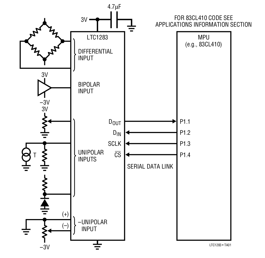 The 8-channel input multiplexer can be configured for either single-ended or differential inputs (or combinations thereof). An on-chip sample-and-hold is included for all single-ended input channels. The serial I/O is designed to be compatible with industry-standard full-duplex serial interfaces. It allows either MSB-or LSB-first data and automatically provides 2's comple-ment output coding in the bipolar mode. The output data word can be programmed for a length of 8-, 10-, 12-, or 16-bit. This allows easy interface to shift registers and a variety of processors. Both the LTC1283A and LTC1283 are specified with offset and linearity errors less than ±0.5LSB. The LTC1283A has a gain error limit of ±1LSB. The 1283 is specified with a gain error limit of ±2LSB for applications where gain is adjustable or less critcial.