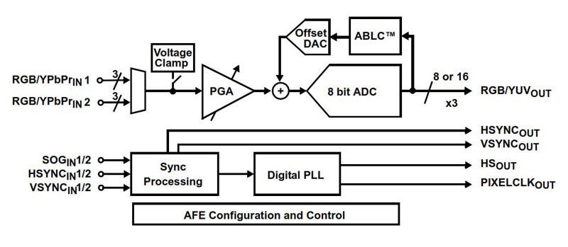 To minimize noise, the X98017's analog section features 2 sets of pseudo-differential RGB inputs with programmable input bandwidth, as well as internal DC restore clamping (including mid-scale clamping for YUV signals). This is followed by the programmable gain/offset stage and the three 170MSPS Analog-to-Digital Converters (ADCs). Automatic Black Level Compensation (ABLC™) eliminates part-to-part offset variation, ensuring perfect black level performance in every application.