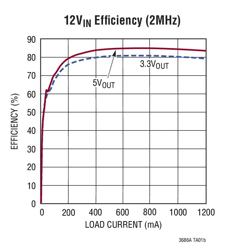 The LT3686A is a current mode PWM step-down DC/DC converter with an internal power switch. The wide input range of 3.6V to 37V makes the LT3686A suitable for regulating power from a wide variety of sources, including 24V industrial supplies and automotive batteries. Its high maximum frequency allows the use of tiny inductors and capacitors, resulting in a very small solution. Operating frequency above the AM band avoids interfering with radio reception, making the LT3686A particularly suitable for automotive applications.