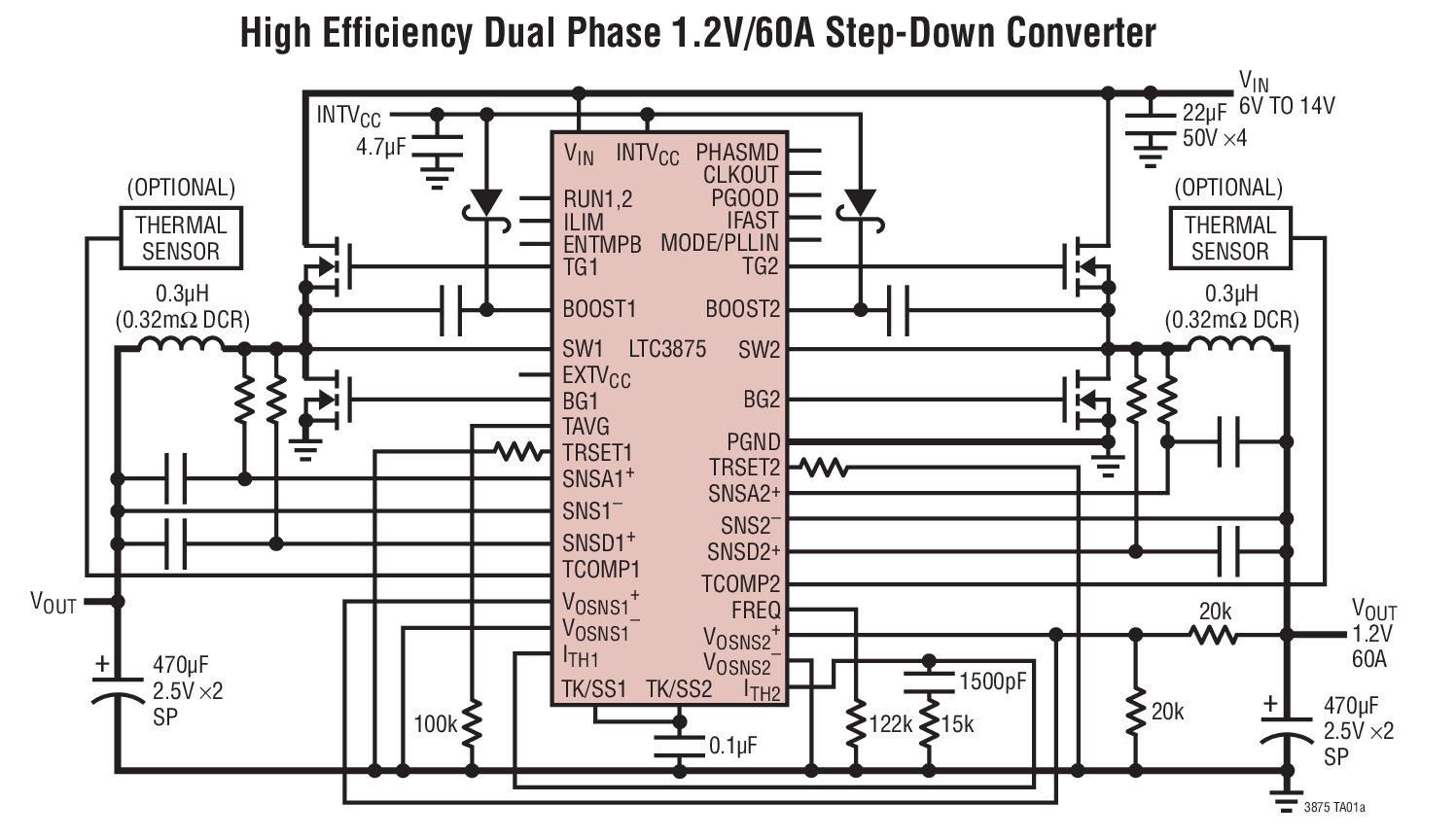 | DC2000A | LTC3875EUJ Demo Board | 4.5V ≤ VIN ≤ 14V; VOUT1 = 1.0V @ 30A, VOUT2 = 1.5V @ 30A | Contact Factory |