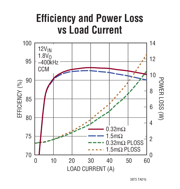 The LTC3875 features two high speed remote sense differential amplifiers, programmable current sense limits from 10mV to 30mV and DCR temperature compensation to limit the maximum output current precisely over temperature.
